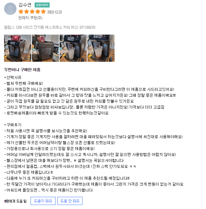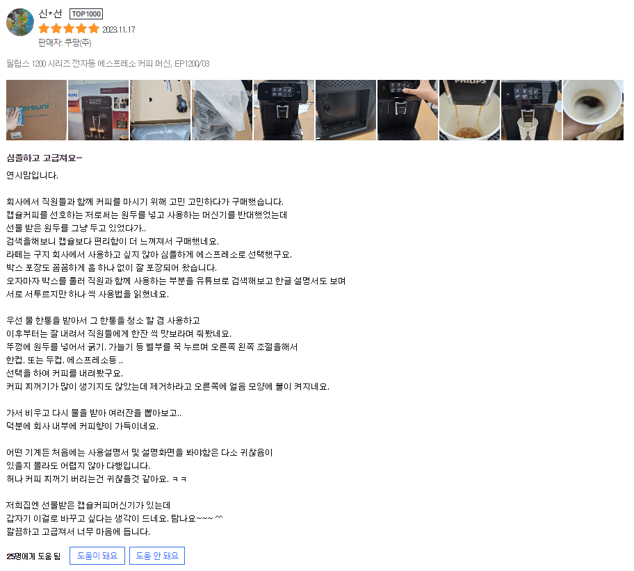 그럼 이만 삶의향기가 필립스 1200 시리즈 전자동 에스프레소 커피 머신 후기를 전해드렸습니다. 더 궁금한 사항이 있다면 언제든지 댓글을 남겨주세요. 모두들 행복한 커피 타임 되세요!