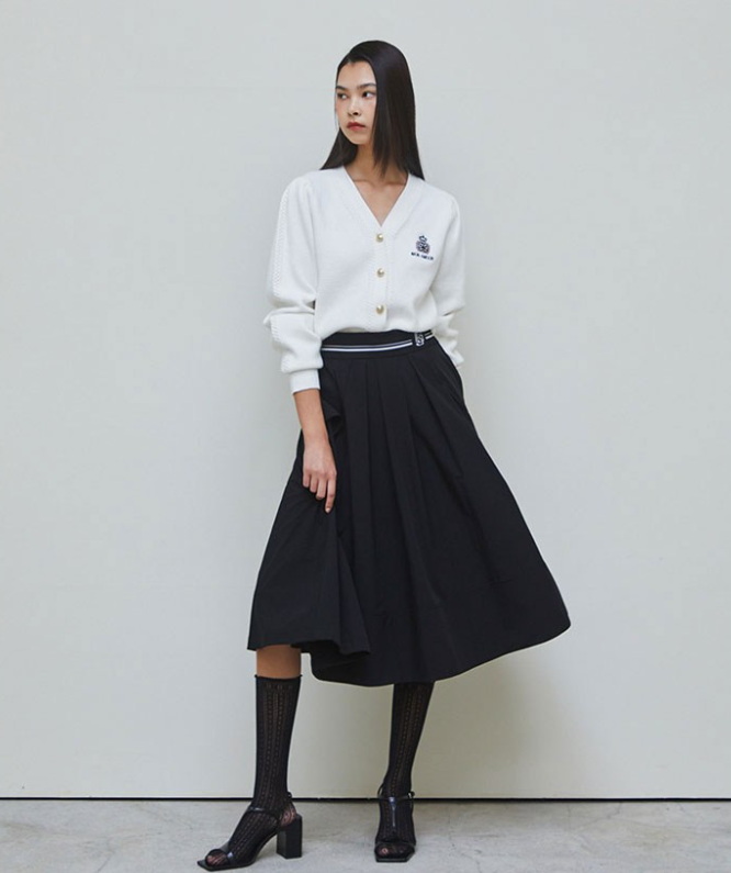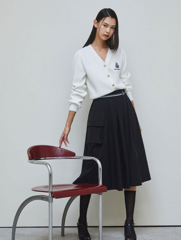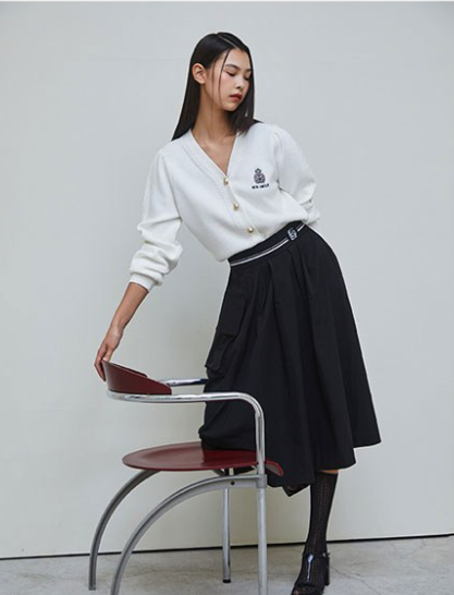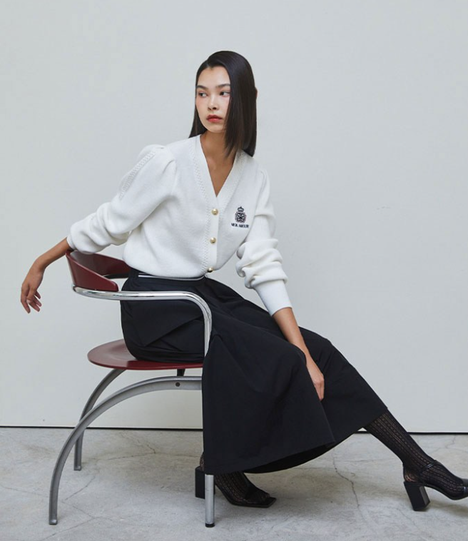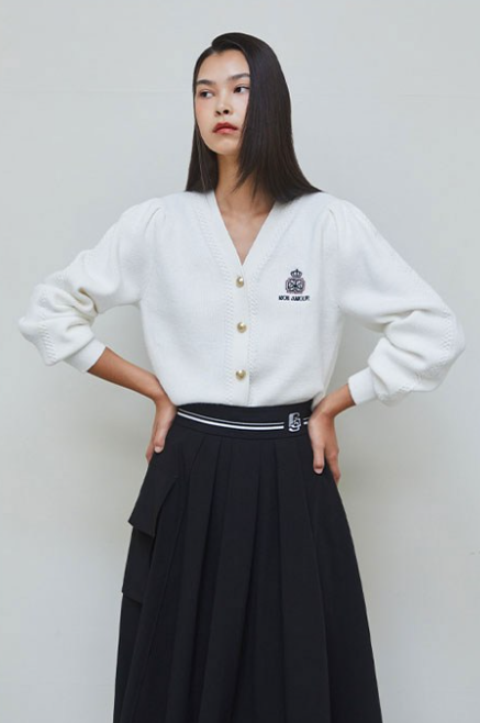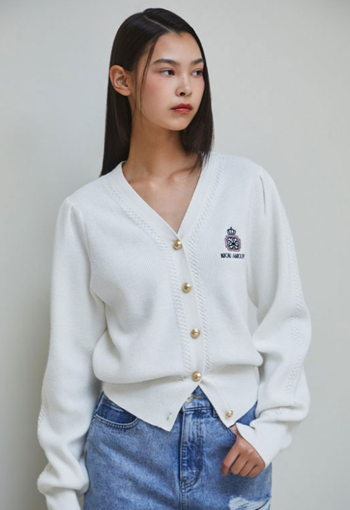 이 가디건의 가장 큰 특징은 가슴 부분에 들어간 엠블럼 자수 포인트입니다. 전체적인 디자인은 심플하지만 작은 디테일 하나로 밋밋하지 않은 분위기를 만들어 줍니다.
